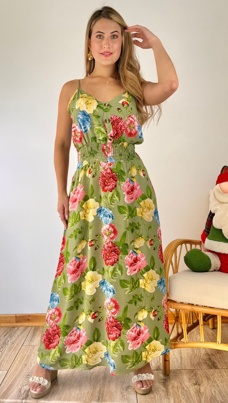 DESCRIPCION: LINDO VESTIDO FLOREADO CON ELASTICO EN CINTURA Y BOTONES DE ADORNO.
