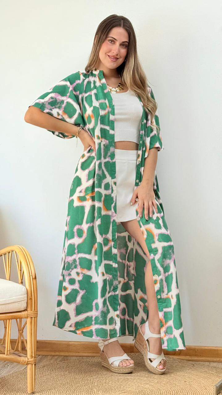 DESCRIPCION: HERMOSO VESTIDO CON BOTONES, SE PUEDE USAR TAMBIEN ABIERTO COMO TAPADO O BLUSON, TELA TIPO SATIN.